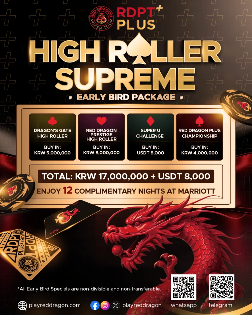 4. High Roller Supreme – KRW 17,000,000 plus USDT 8,000 includes entry to Dragon’s Gate High Roller, the Red Dragon Prestige High Roller, the Super U Challenge, and the Red Dragon Plus Championship, along with twelve complimentary nights at Marriott.
