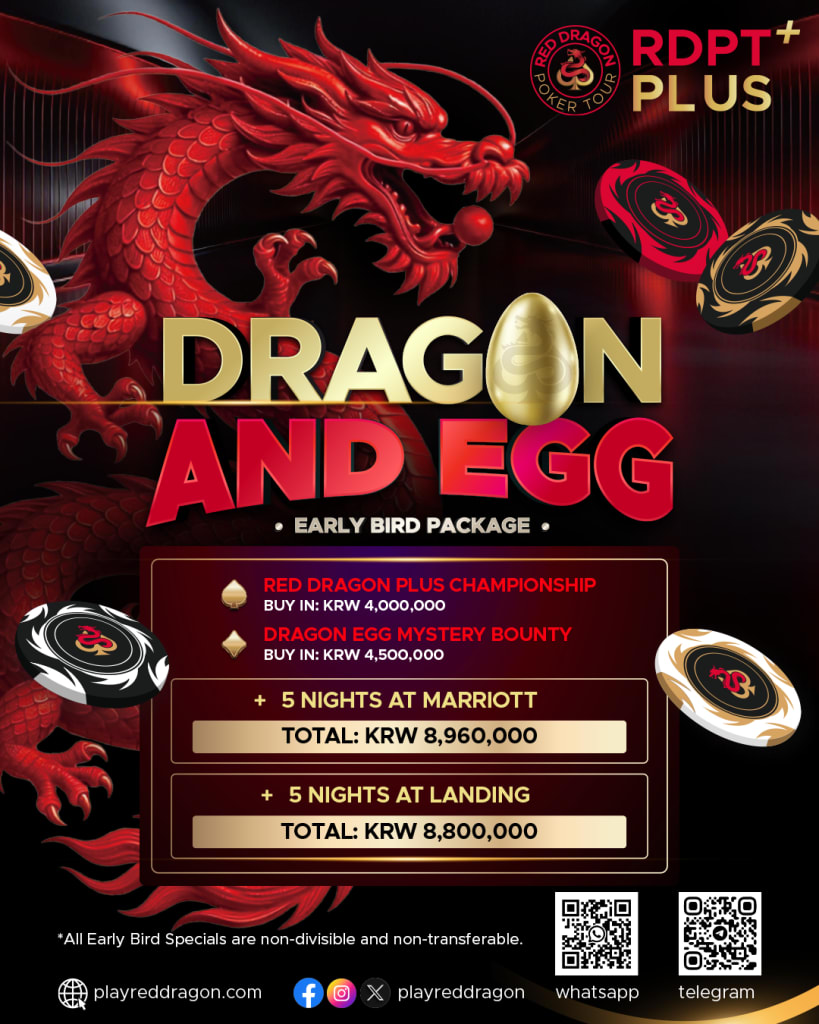 2. Dragon and Egg – KRW 8,960,000 (5 Marriott nights) or KRW 8,800,000 (5 Landing Casino nights) includes entry to the Red Dragon Plus Championship and the Dragon Egg Mystery Bounty, together with five nights of accommodation at either Marriott or Landing.
