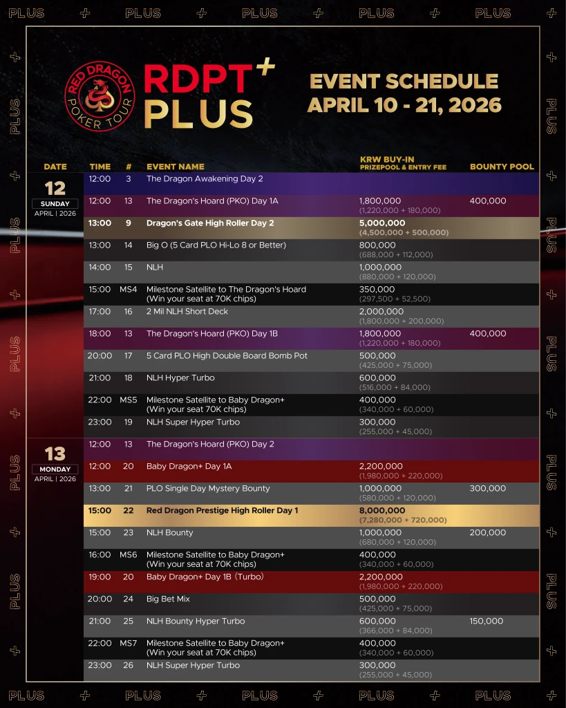 The Red Dragon Poker Tour returns to Jeju this April with the launch of RDPT PLUS , a new series designed around depth, structure, and clearly defined championship moments. Running from April 10 to 21 at Les A Casino, formerly Landing Casino , RDPT PLUS moves away from the crowded festival model and instead presents a tightly curated lineup built for players who value endurance and long-form competition.